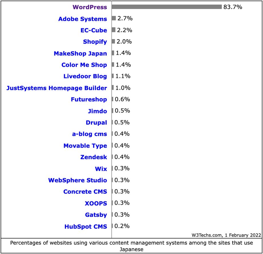日本国内での CMS シェアを知るには、 Distribution of content management systems among websites that use Japanese のページに掲載されている情報「日本語を使用するWebサイトのCMSシェア」の方が、より身近なシェアになるのではないでしょうか。不動の WordPress は、断トツの1位で日本国内のシェア 83.7% 世界の 65.3% よりも高い結果となっています。