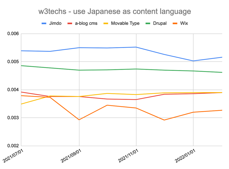 Jimdo 、Drupal、a-blog cms 、Movable Type 、Wix の比較を、夏からの情報でグラフに紹介しておきます。今月も大きな変動はありませんが、a-blog cms と Movable Type が 0.390% と全く同じ数字で逆転しておりました。