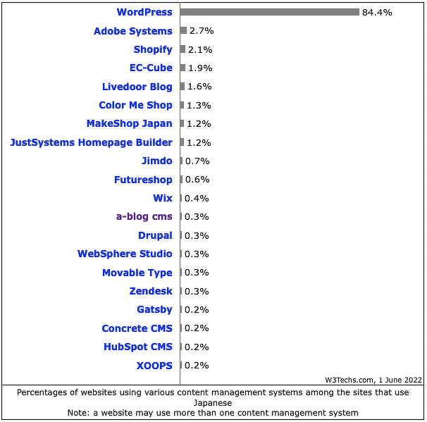W3Techs.com では、日々の CMS (Content Management System) のシェアとして Usage statistics of content management systems が公開されています。WordPress のシェアが 2022年2月の 65.3% から4ヶ月連続で減少してきている状況ではありますがダントツの1位を独走は変わりありません。今月数値が上がっているものはありませんでした。