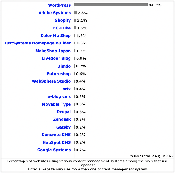 弊社では W3Techs にサイト上に公開されている数値より細かい数字を共有いただいています。( Japanese Share については数字が細かいところまで掲載しております。)