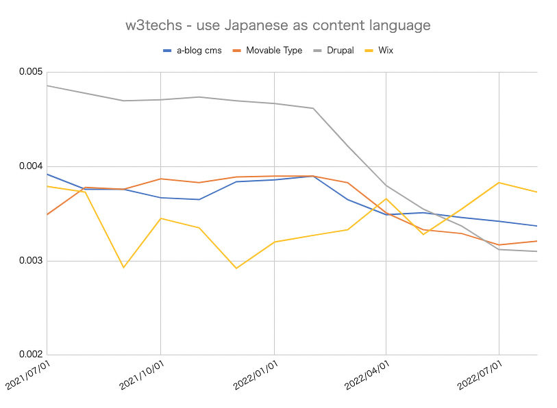 Jimdo の数字が倍くらい違ってきているので、比較からは外す事にしました。Drupal、a-blog cms 、Movable Type 、Wix の比較となり、昨年の夏からの情報でグラフに紹介しておきます。先月との比較としては順位としては変化無しという事になります。