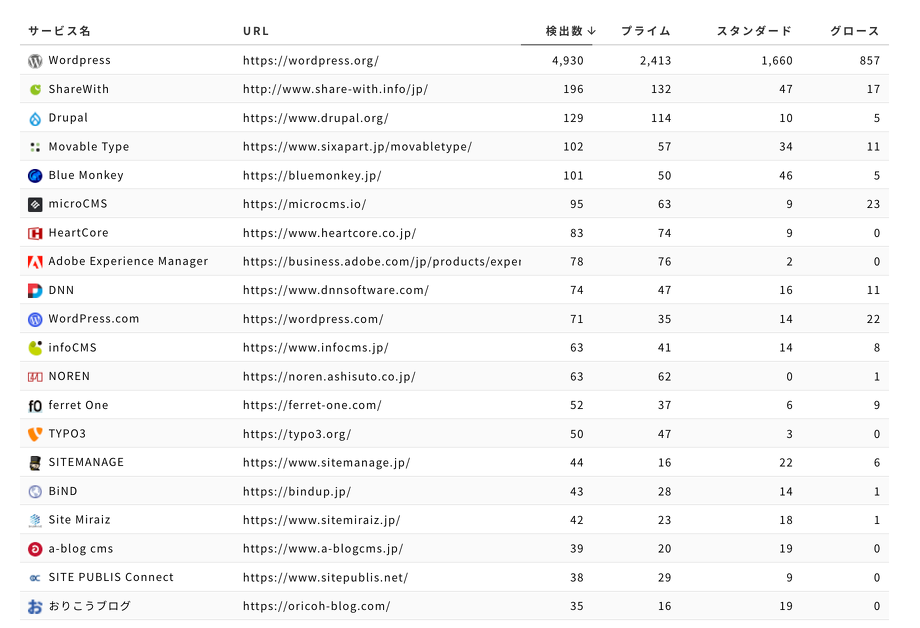 毎年夏にアップデートされるこちらのデータが更新されました。大手のウェブサイトでどのようなものが使われているかのデータになります。 https://oshiete-url.jp/report/cms/2024_8/