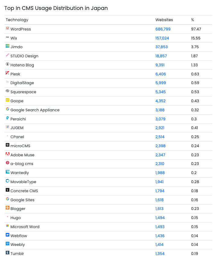 また、日本では Color Me Shop、EC-Cube、Studio、a-blog cms など、国内で開発・提供されている CMS や EC プラットフォームが上位に入り、地域特性に合わせたサービスのニーズが根強いことがうかがえます。一方で、世界的に利用されている Joomla や Wix などは、日本市場では比較的シェアが低く、ユーザーの好みやサポート体制の違いが影響していると考えられます。
