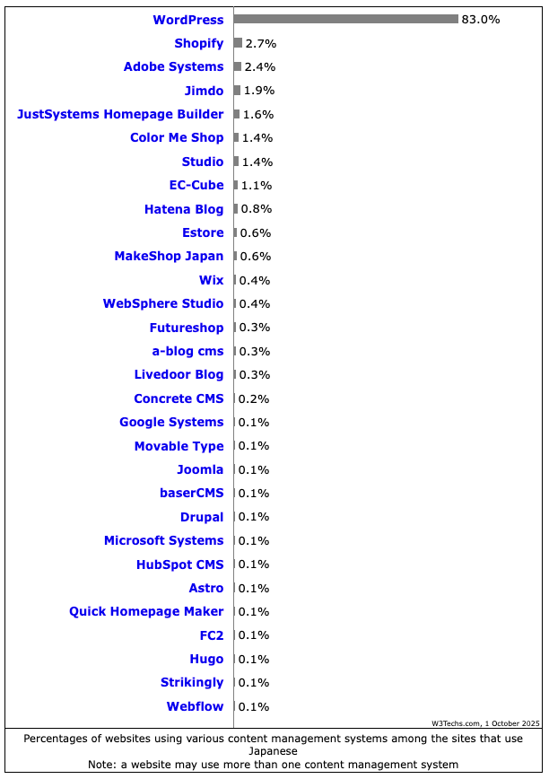 W3Techs のデータによると、2025年10月時点でも WordPress が 83.0% で圧倒的なシェアを維持しています。