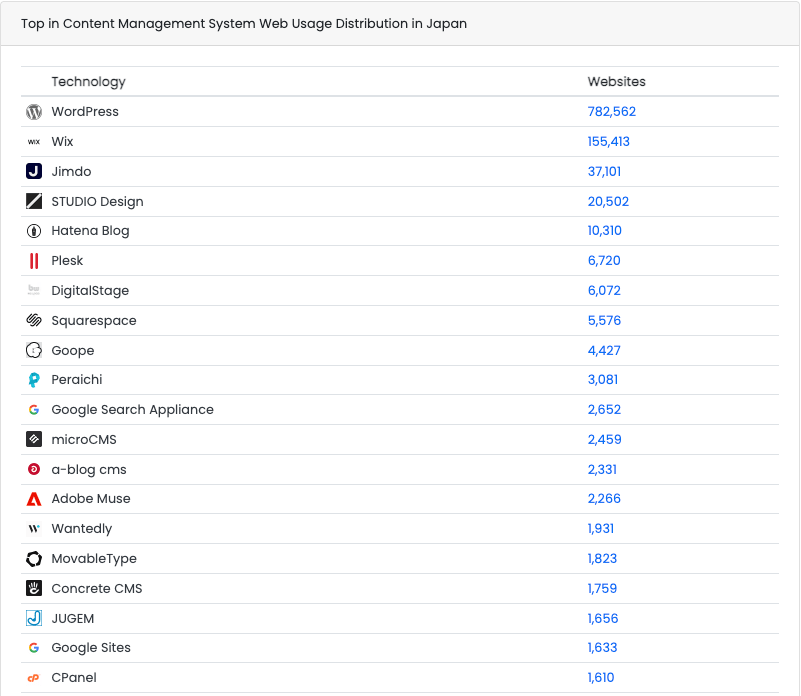 BuiltWith の日本向けデータ(2025年10月)では、W3Techs とやや異なる傾向が見られます。