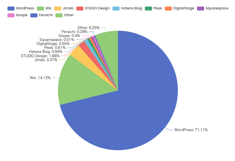 builtwith の CMS Usage Distribution in Japan については、2025年9月28日 が最終更新日と書かれています。毎日アップデートされているものではありませんが、この1ヶ月以内のデータになります。以前は、円グラフが上位3位までしか表示されておらず、それ以降は Other だったのが 10位まで表示に変わりました。