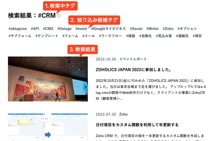 弊社の a-blog cms では、標準的に上記に書かれている機能を標準的に搭載しており、コンテンツの絞り込み検索をしっかりできるように作られており、タグクラウド・タグフィルターの UI や、検索機能についてもあらかじめ用意されたスニペットをテンプレートに配置するだけで利用が可能です。