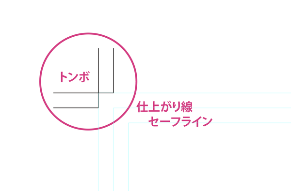 「トンボ」とは、印刷物を裁断する際に切り取られる領域を示す目印です。デザインが用紙の外側に少しはみ出すように配置することで、裁断後にデザインされた領域が足らず、印刷物に白い余白ができてしまうのを防げます。