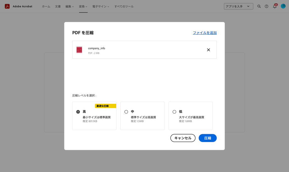 「変換」のタブから「PDFの圧縮」を選び、PDFをアップロードすると3段階(高・中・低)から圧縮率を選択することができます。この時に圧縮した後の推定ファイルサイズが表示されるのが嬉しいポイントです。適切な圧縮率を選んでファイルサイズを最適化しましょう。