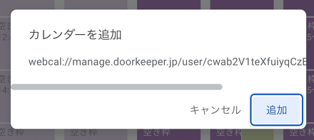 Googleカレンダーに画面が遷移し、カレンダーを追加 のモーダルウィンドウが表示されます。追加 ボタンをクリックすると「他のカレンダー」に Doorkeeper イベント というカレンダーが追加されます。