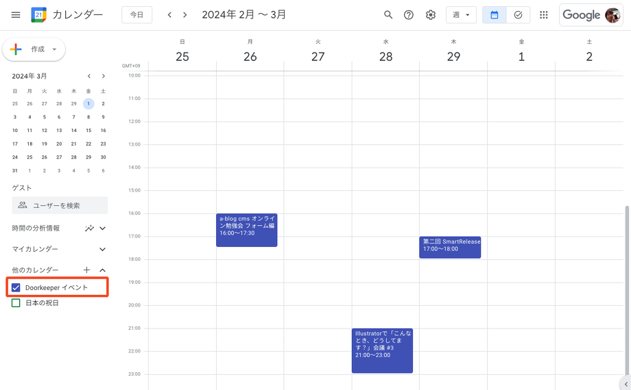 そこで 参加イベント の Googleカレンダー をクリックしてください。