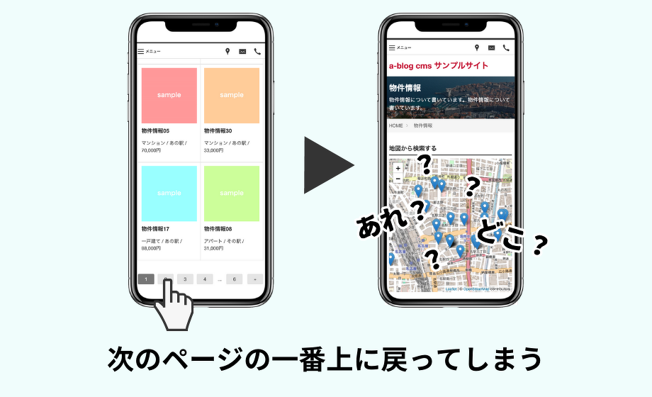 従来のページング処理では、ユーザーが新着情報やお知らせのリストの下部にあるページャーをクリックすると、ページ全体がリロードされ、ブラウザがページの一番上に移動してしまいます。これは、特にスマートフォンユーザーにとって、読みたい情報の続きを見る際に不便を感じさせる体験です。