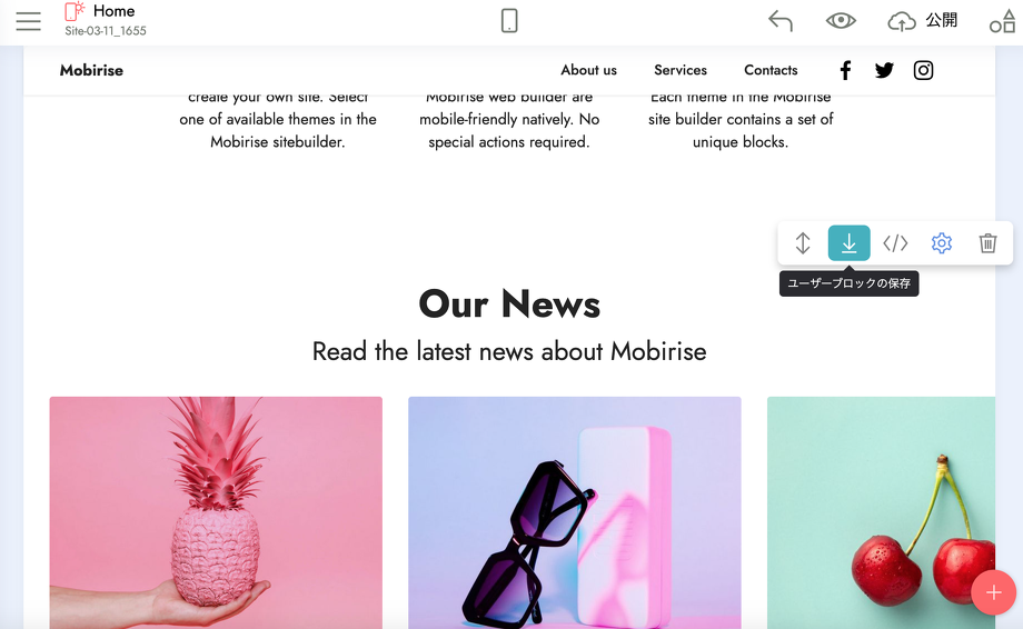 そこでしばらくMobiriseを使っていくうちに「ユーザーブロックの保存」ボタンに気が付きました。なんだろうと思いクリックしてみると、なんと自分が調整したパーツが保存されたんです...!!
