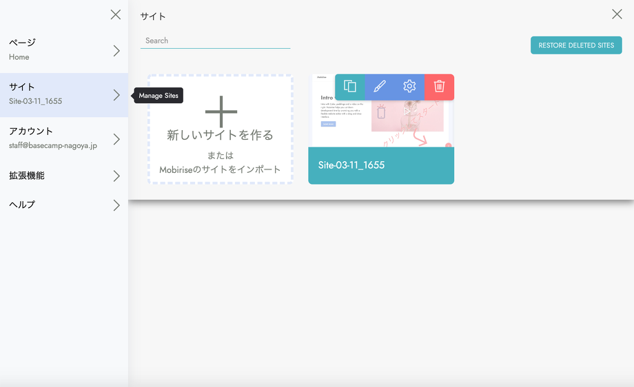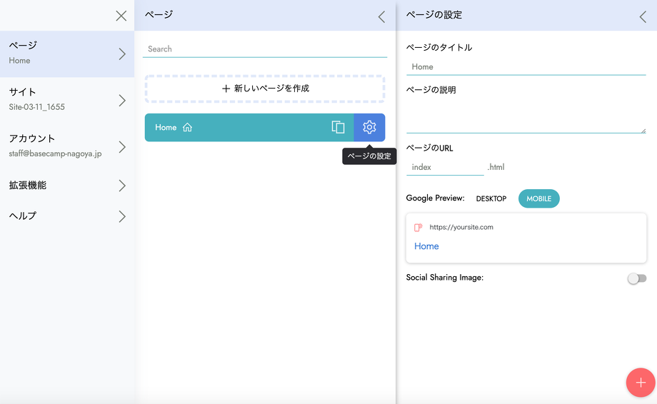 また、「サイト」では新しいサイトを追加できたり、先程のページ名等の編集をすることができます。