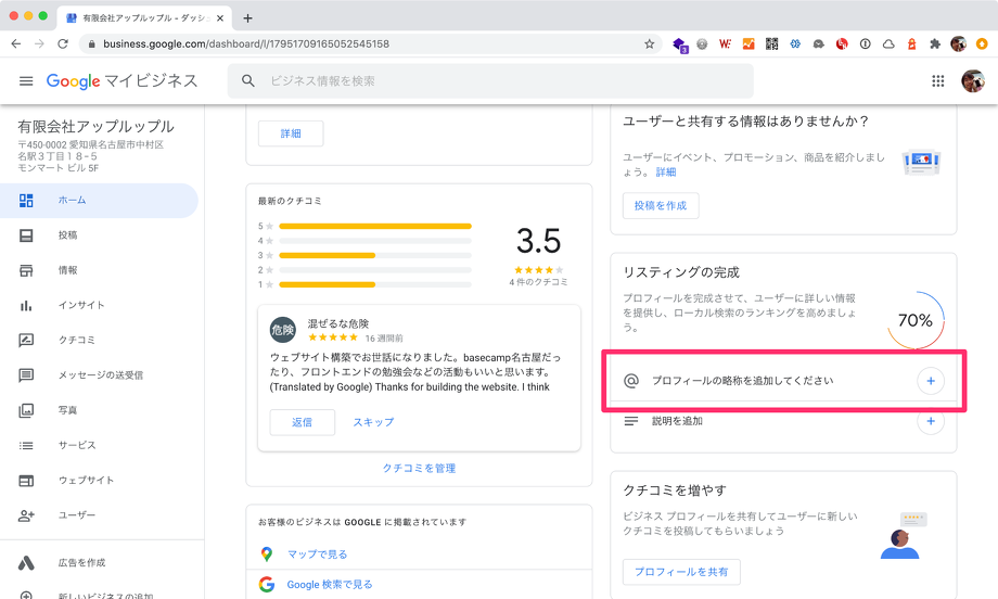Google マップをしっかり活用する際には、Google マイビジネス の設定が大事になります。 その中で、設定が漏れていると「リスティングの完成」という見出しで「プロフィールの略称を追加してください」というメニューが見つかります。(下のキャプチャ画像で赤い枠の部分になります)