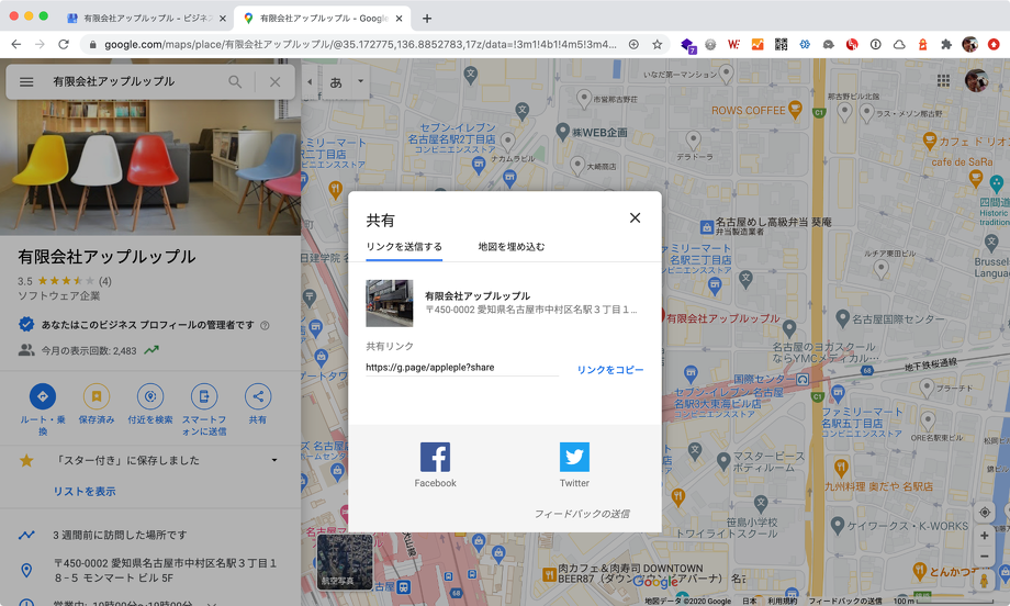 例えば 「名古屋駅」 を表示させて、何も設定がしてないとリンクのURLを取得すると https://goo.gl/maps/Z2ViAumUHuAo5pLP6 となっていますが、皆さんの店舗はどうでしょうか?