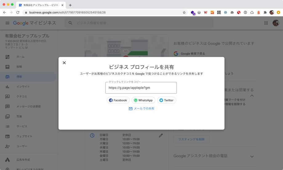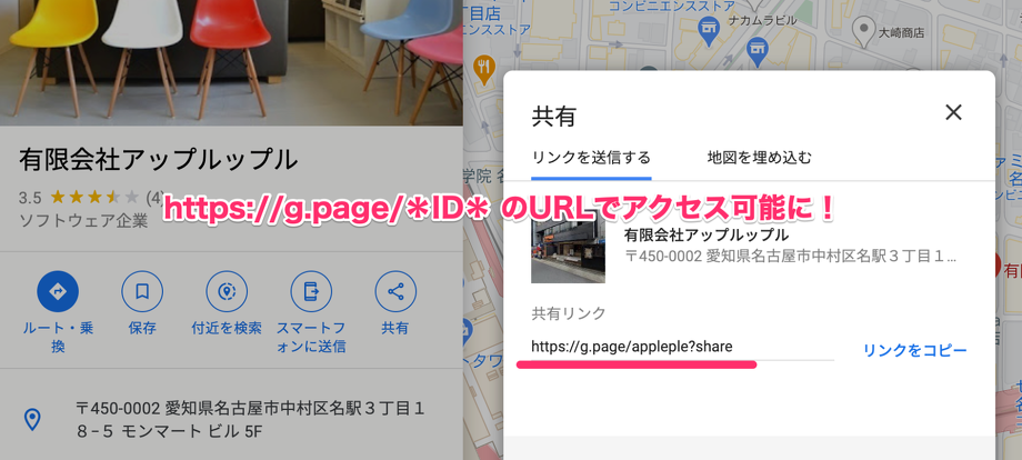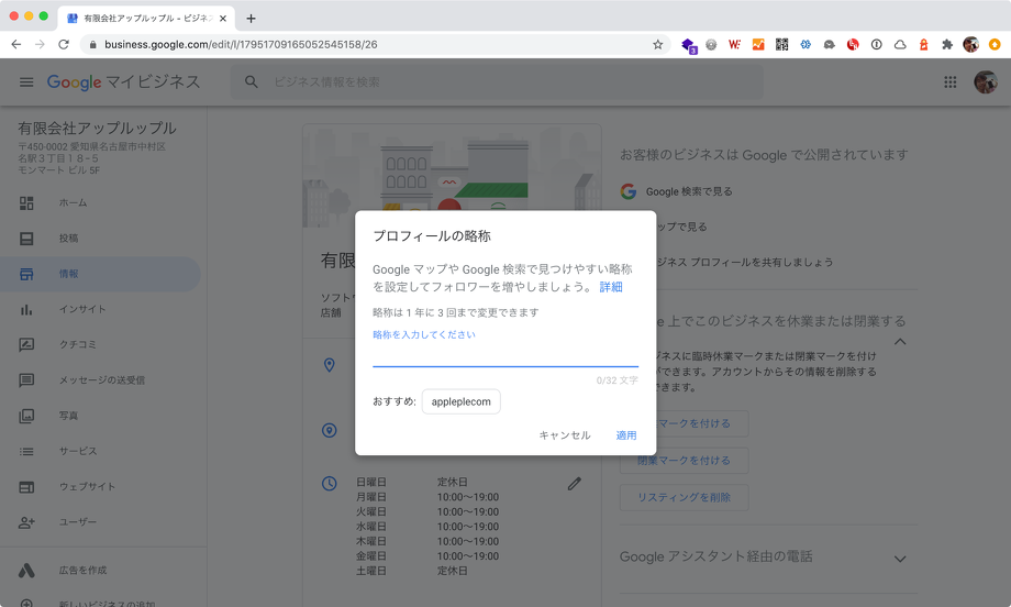 以前「店舗を持っているのなら Google マイビジネス をしっかり運用しよう」というブログ記事も書きましたが、Google マップ大事なので、ぜひ「プロフィールの略称」を登録しておきましょう。 メールや、Twitter・LINE などのテキストでのコミュニケーションで、場所を伝える際に https://g.page/appleple にいるよ! って伝えやすくなります。
