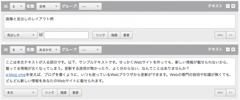 a-blog cmsでは、エントリー(記事)の編集画面で、ユニットと呼ばれるブロックと組み合わせて利用されています。