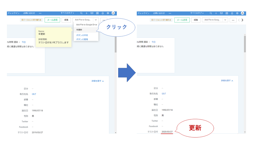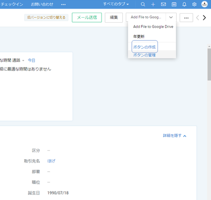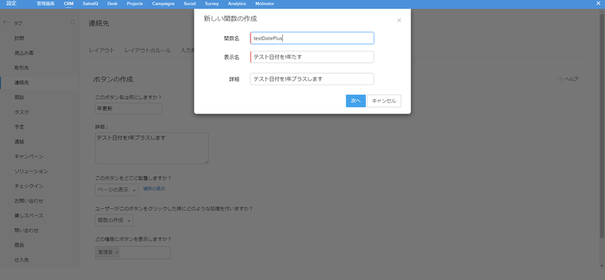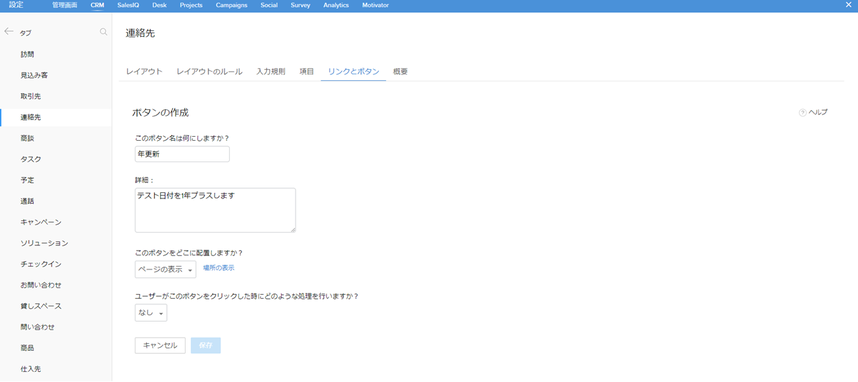クリックすると、ボタンの作成画面に遷移するので、作成するボタンについての詳細を記述します。 今回作成したボタンでは、ボタン名を「年更新」、詳細を「テスト日付を1年プラスします」、ボタンの配置位置を「ページの表示」、ユーザがクリックしたときの処理を「関数の作成」としました。