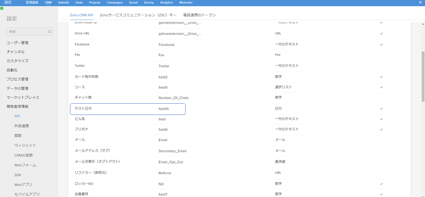 プログラム中のfield15というのは、「テスト日付」のAPI名です。このAPI名は、CRMタブ右上の設定(歯車マーク)→開発者情報のAPIをクリック→API名→連絡先とクリックしていくと、それぞれの項目名に対応するAPI名を確認することができます。