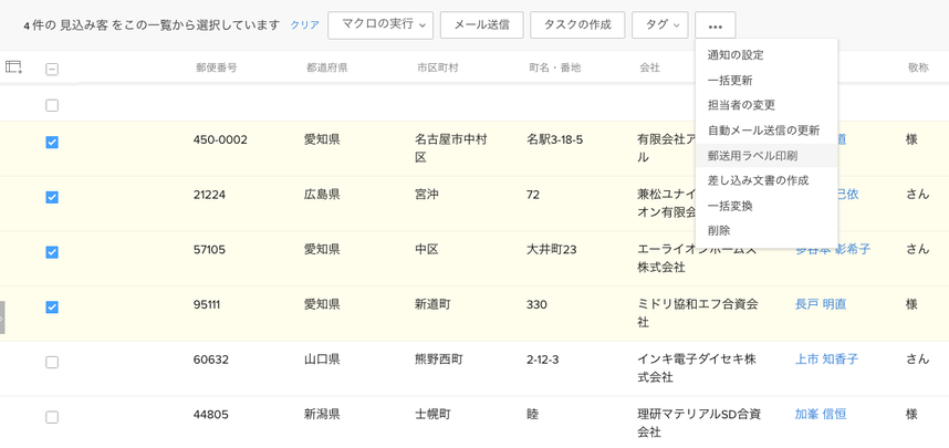 次に、印刷したいデータにチェックをつけ、チェックをつけると表示されるメニューの「・・・」のプルダウンメニューより「郵送用ラベル印刷」を選択します。
