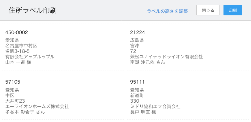 実運用で利用できるか微妙ではありますが、基本は1項目毎に改行されてラベル印刷するようなプレビュー画面が表示されます。(「敬称」だけは特殊で氏名の後ろに並んで表示されるようになっています)あとは印刷ボタンをクリックで印刷が可能です。