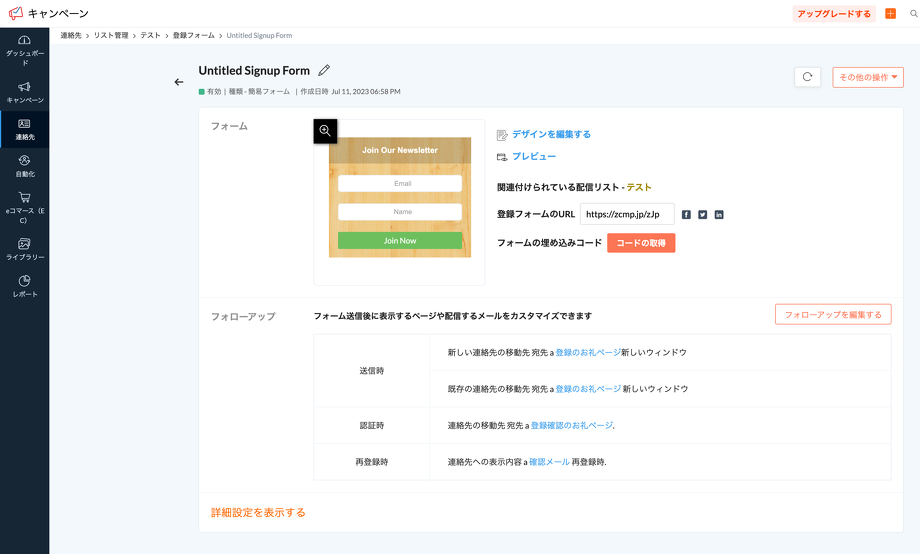 左メニューの連絡先>リスト管理>リストを選択>Forms>フォームを選択>フォローアップ