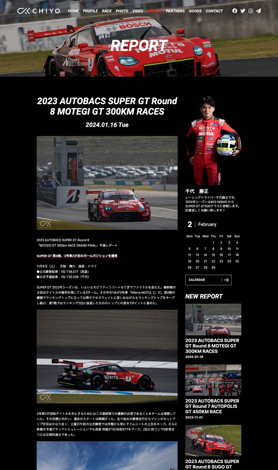 レースの関係でテレビや雑誌などいろんなメディアの人たちがいらっしゃいます。その人たちからインタビューを受けることがよくあります。そこで聞いた話ですが、メディアの方はインタビューするドライバーのホームページなどはよく確認するそうです。そのメディア関係者の方々から、いろんなドライバーの情報を調べる中で千代選手のホームページが一番見やすいと言ってもらえるようになりました。やっぱり僕の過去を遡ることができる点が見やすいと言っていただける理由だと思います。