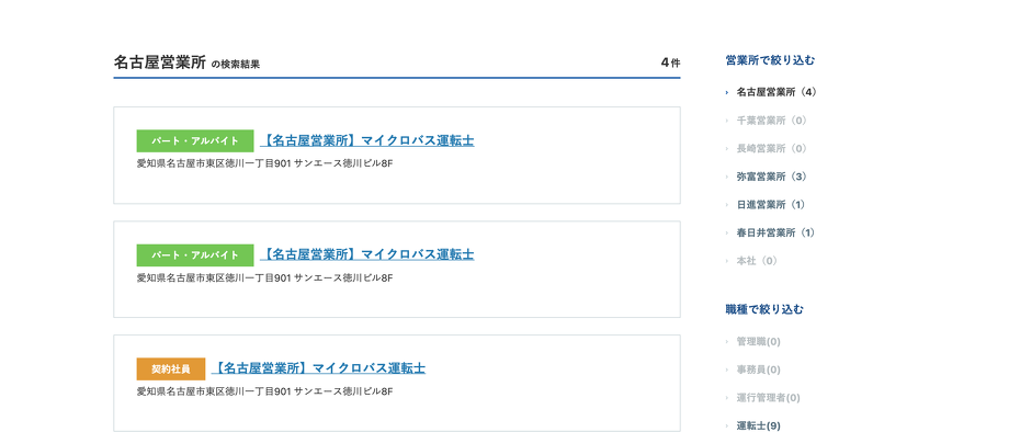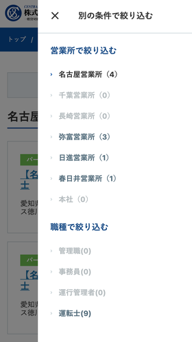 求人検索は採用情報のメインとなるページに機能ごと組み込み、募集中の営業所や職種が最短ルートで確認できる構成としました。また募集状況も適宜細かく掲載する運用を目指し、募集中の項目については募集数を、募集していない項目についても掲載は継続したまま機能のみ無効にすることで、いつでも求人の全体像が把握できるような表示としています。