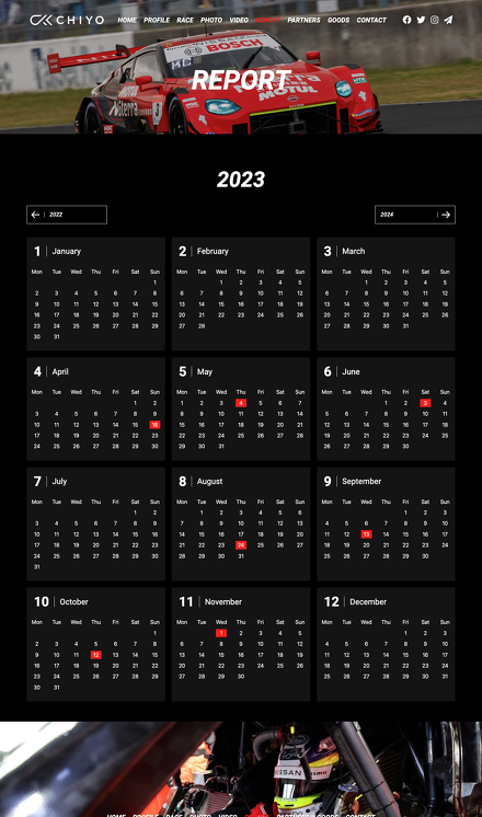 REPORTページでは各レースごとに詳細なレポートを公開しており、レースごとにレポートの数も増えていきます。ユーザーが特定のレポートを簡単に見つけられるように、カレンダー機能を導入しました。このカレンダーを使えば、特定の日付のレースレポートを簡単に探すことができつため、ファンや関係者にとっては使いやすい設計となっています。