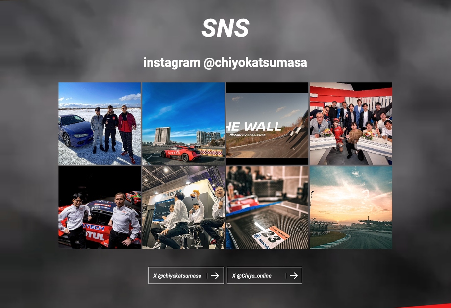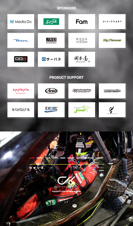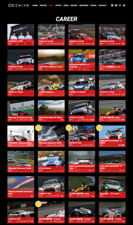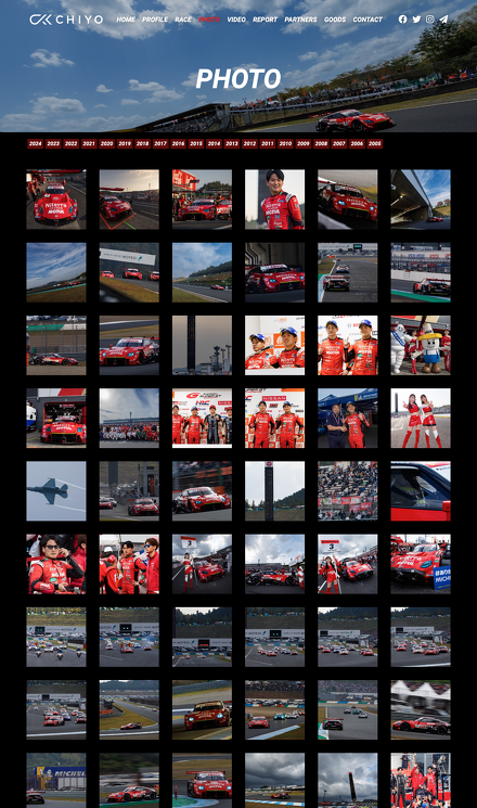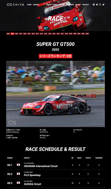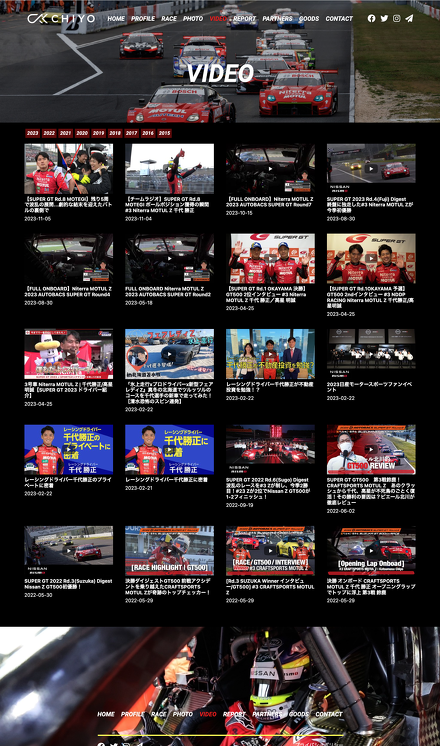 千代選手のオフィシャルサイトには、撮影された写真やレース関連の動画コンテンツが豊富に収録されています。PHOTOページでは、写真を惜しみなく一挙に公開しており、モータースポーツの雰囲気や千代選手のレース中の姿を感じられるようなレイアウトになっています。また、PHOTOページやVIDEOページでは、年ごとにカテゴリ分けが可能であり、過去のレースを振り返りたいユーザーのニーズに応える設計となっています。