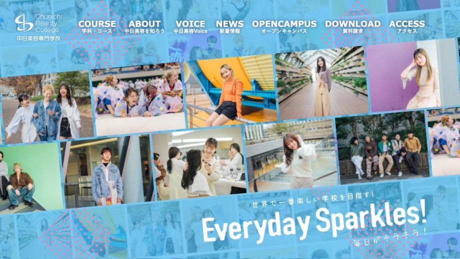 美容に興味のある学生の憧れでもある中日美容専門学校。デザインについても、パンフレットで使用されている学校カラーを取り入れつつ、Web特有の動きを取り入れた遊び心のあるテイストを追求しました。