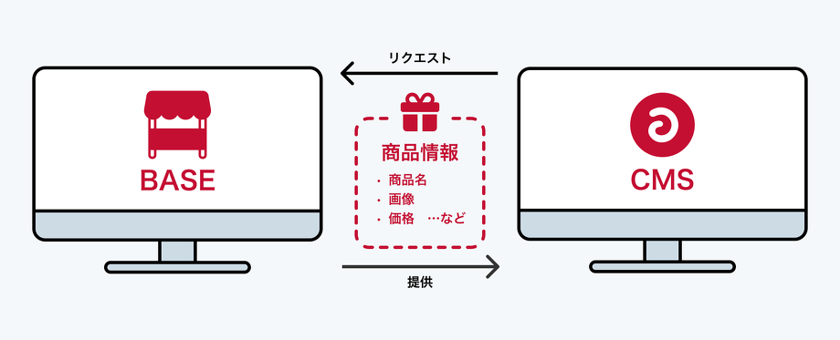 今回の場合は、Webサイトには商品情報を登録する仕組みは作らず、BASEに登録された商品情報をWebサイトに共有することで、Webサイト上に商品名や画像などの情報を表示しています。