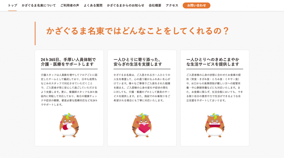 またかざぐるま名東様の公式キャラクター「いのぷ〜」をWebサイト全体に取り入れたいというご要望をいただいたので、表情のバリエーションをつけたイラストを複数作成し、文字だけでは読み進めづらいコンテンツに対して少しでもユーザーの心理的負担を下げるようレイアウトしました。