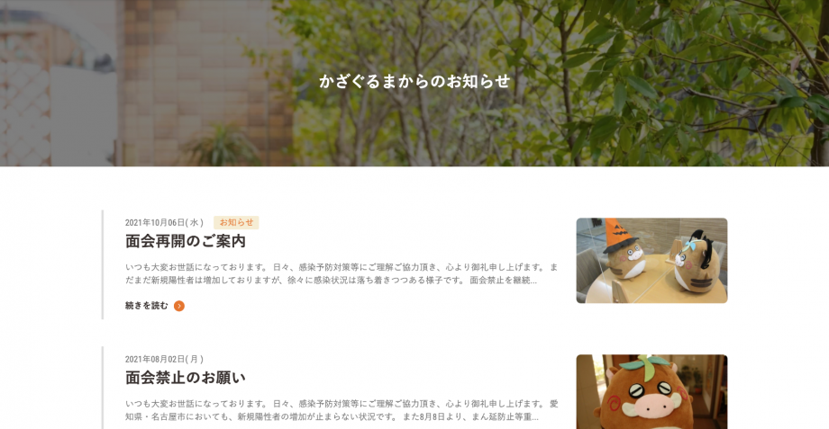 以前のWebサイトでは面会のお知らせなど重要度の高い案内が適切にアピールできず、利用者とのコミュニケーション面で不便を感じられていたそうです。そこで今回はお知らせ以外のほぼ全てのコンテンツに更新可能なシステムを組み込み、さまざまなページで多方から施設の取り組みを伝えられるよう改修しました。