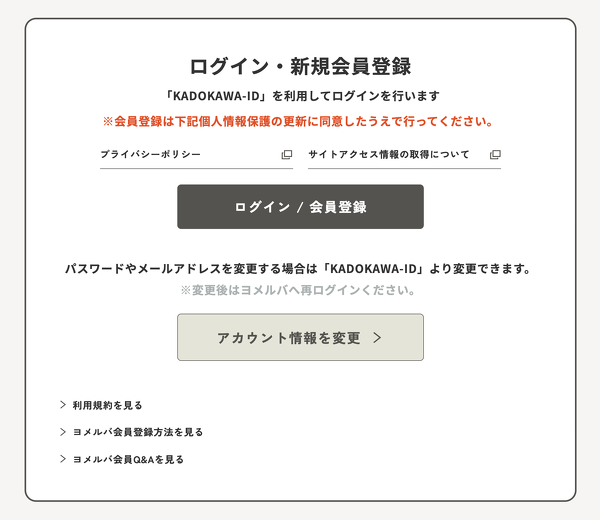 メールアドレスや各SNSを使用したCMS標準の会員登録機能が用意されておりますが、今回はクライアントが独自に提供している KADOKAWA-ID を経由して会員登録やログインをする機能が備わっています。